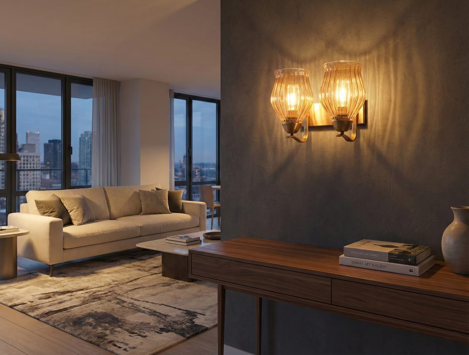 The glass is bell-shaped and open at the bottom, allowing the light to spread effectively while retaining a clean, contemporary silhouette. This sconce provides perfect ambient and accent lighting, ideal for mounting over a console table (as shown in the sleek apartment setting), flanking a mirror, or adding a stylish, balanced light source to modern living rooms and dining areas.