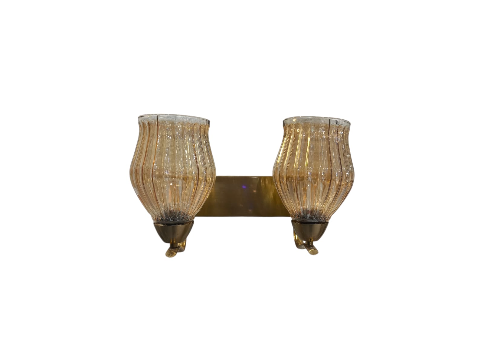 Achieve balanced, sophisticated lighting with this elegant horizontal wall sconce. The fixture features two beautifully shaped shades mounted symmetrically on a sleek, linear brushed brass bar. Each shade is crafted from amber-tinted glass with distinct, vertical fluting (ribbing), giving the light a warm, textured glow.