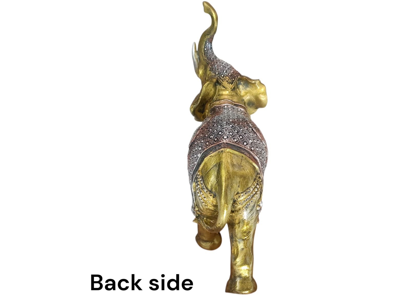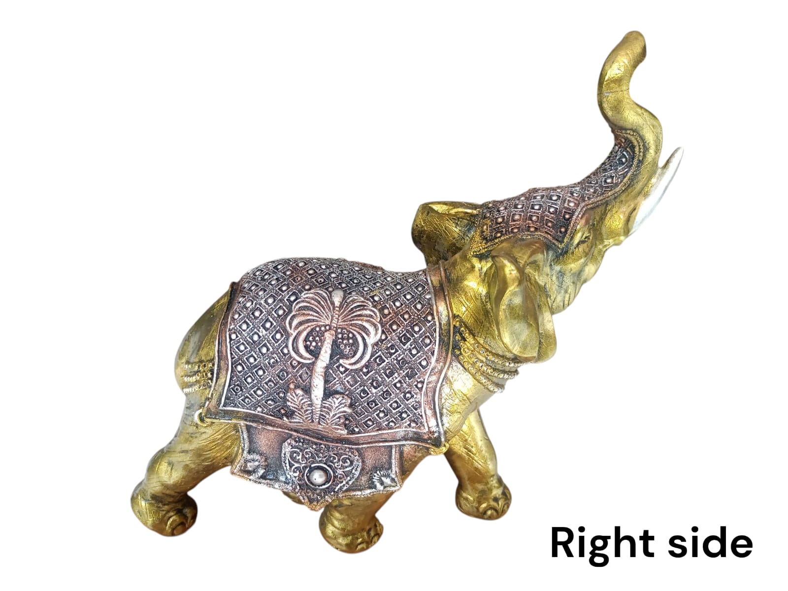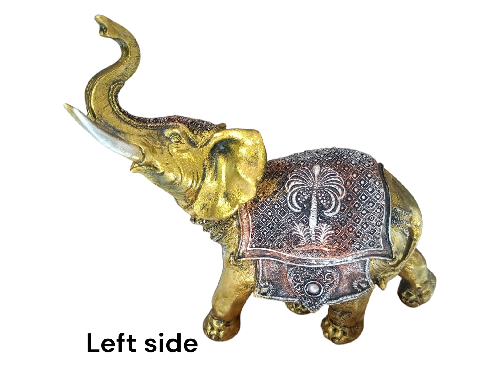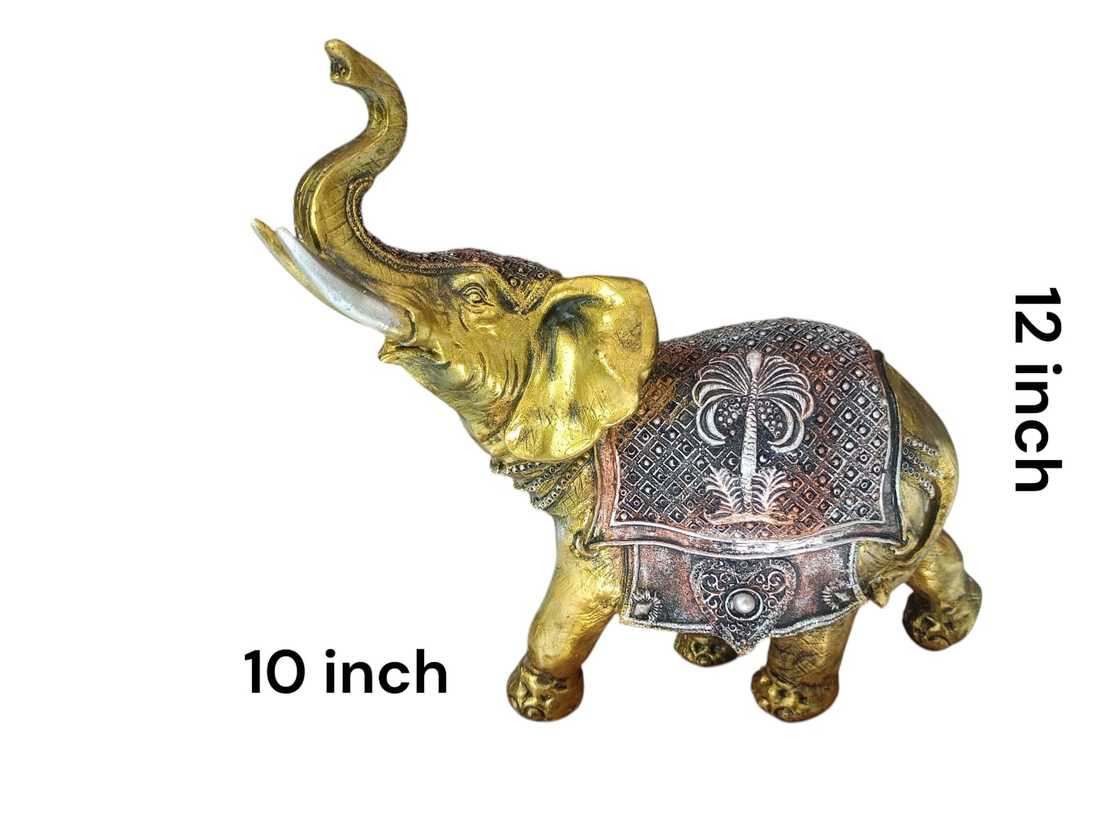 - With its vibrant golden hue and the ornate silver blanket, this sculpture evokes the festive and ceremonial elephants seen in cultural celebrations. It represents joy, tradition, and the spirit of celebration, adding a touch of cultural richness and festivity to home decor.