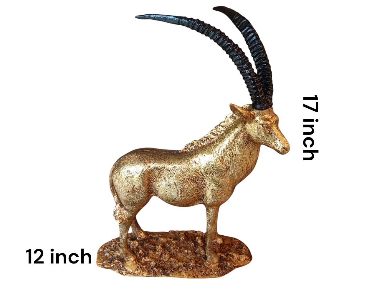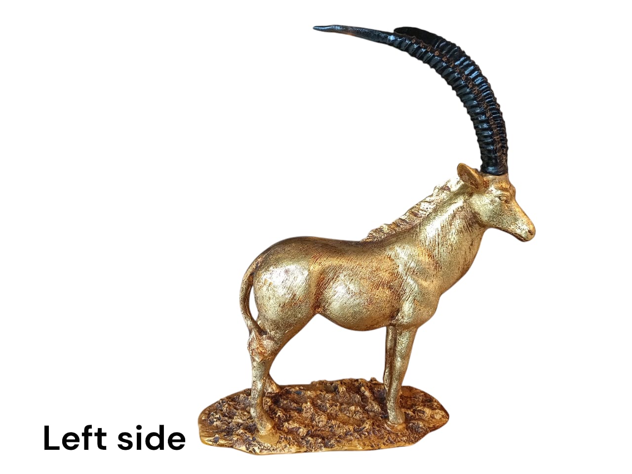 - This striking sculpture, “Golden Oryx,” features a magnificent oryx rendered in a shimmering gold finish with prominent, dark, curved horns. It embodies grace, resilience, and the majestic beauty of wildlife, making a bold and elegant statement in any space.