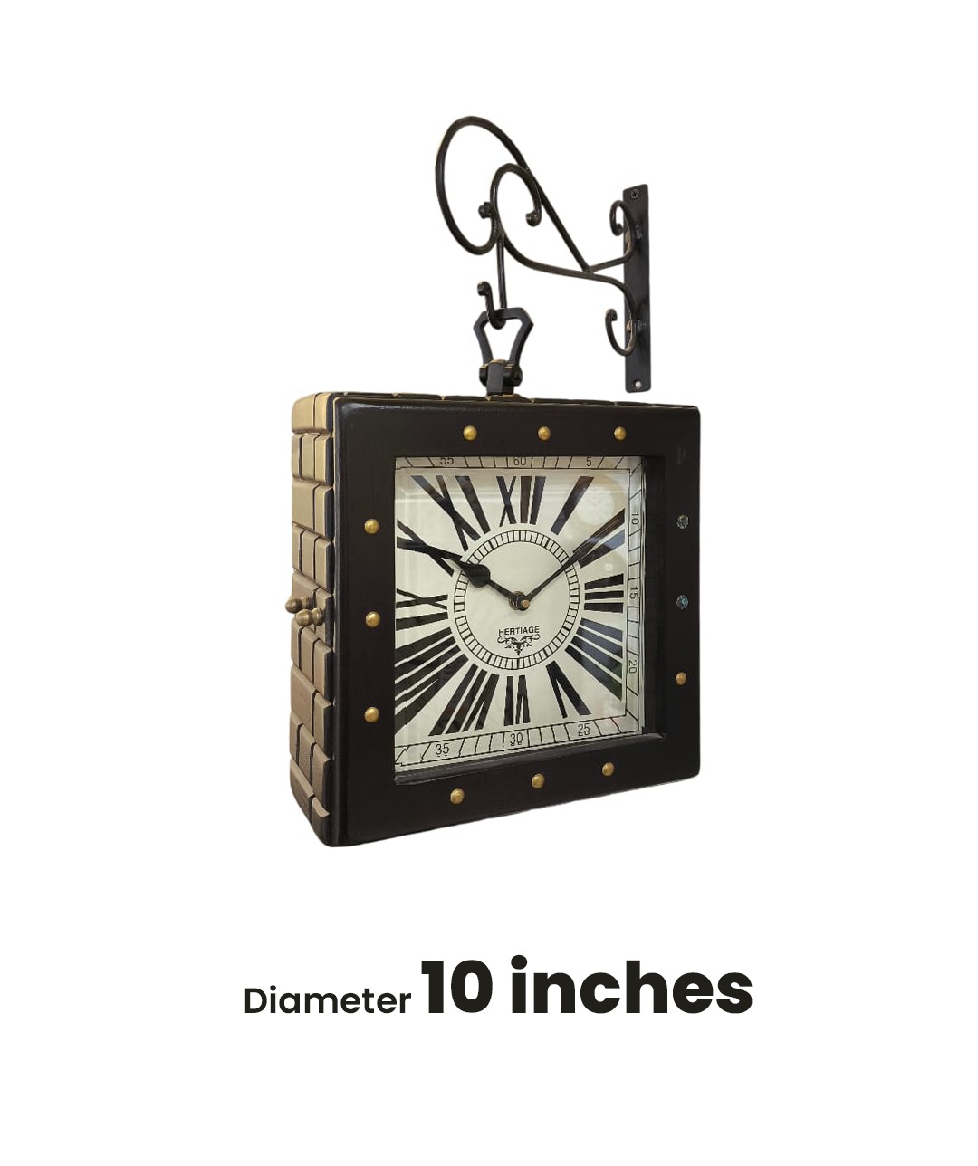 Enhance your wall décor with this elegant Heritage Hanging Wall Clock, designed with a premium antique look. The clock features a sturdy wrought iron bracket that allows it to hang securely on any wall. Its double-sided display ensures clear visibility of time from multiple angles, making it both stylish and functional.