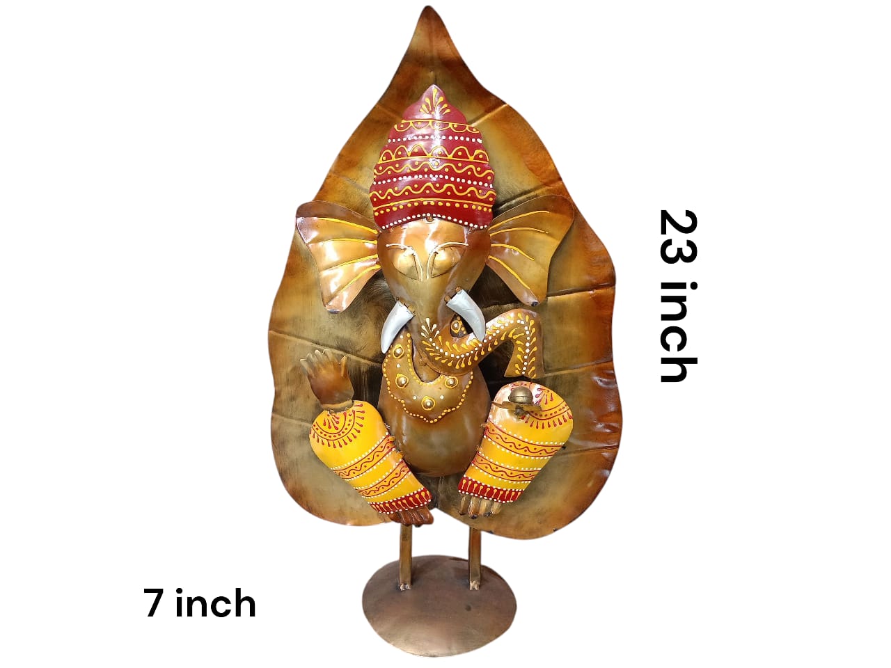 - This unique statue, “Leafy Ganesha,” depicts Lord Ganesha crafted within the elegant shape of a large leaf, adorned with traditional Indian patterns and colors. It symbolizes wisdom, prosperity, and a harmonious connection with nature, offering a beautiful and auspicious presence in any home.