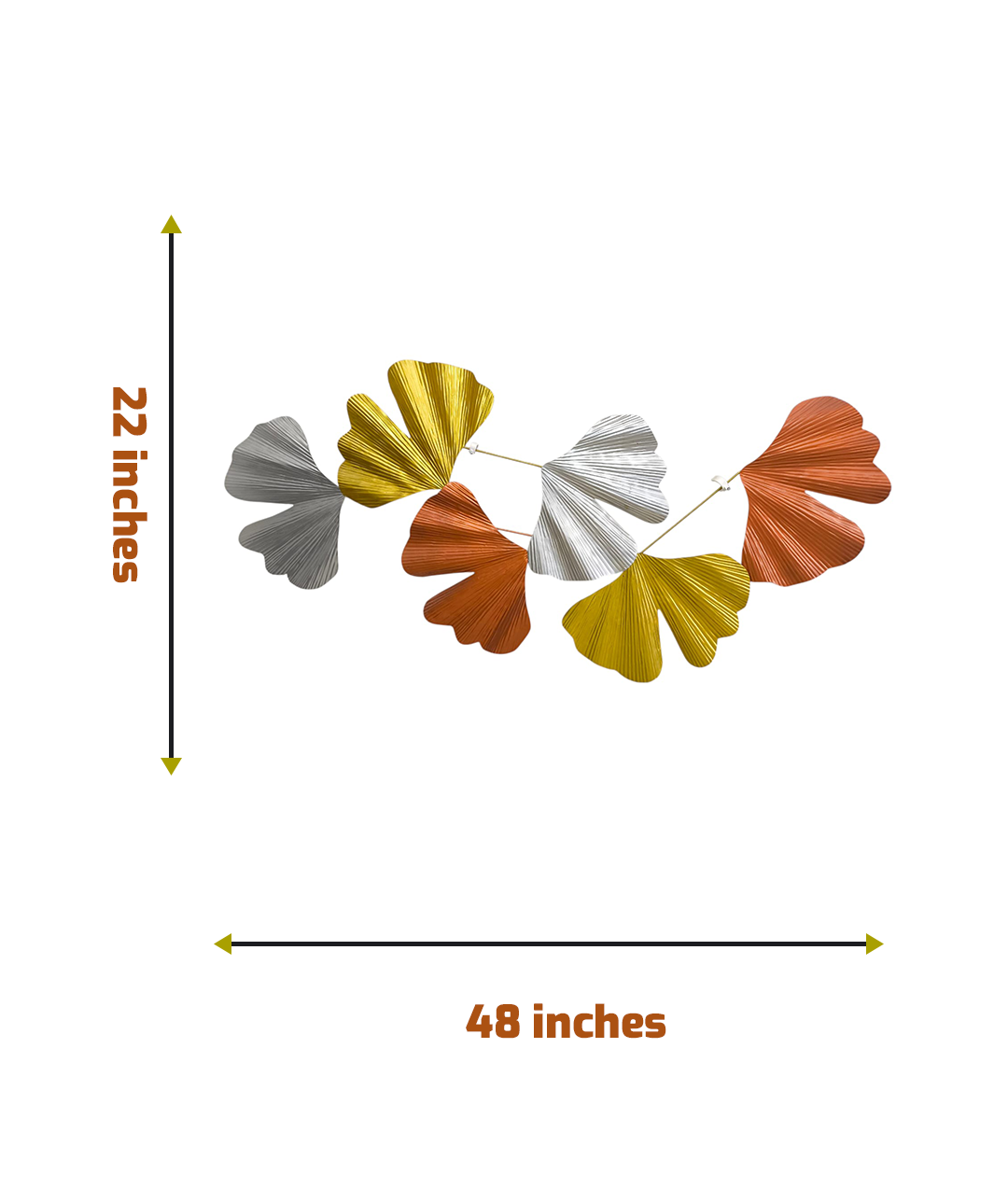 - A decorative wall hanging featuring a series of textured, fan-shaped leaves in metallic gold, silver, and reddish-orange colors.