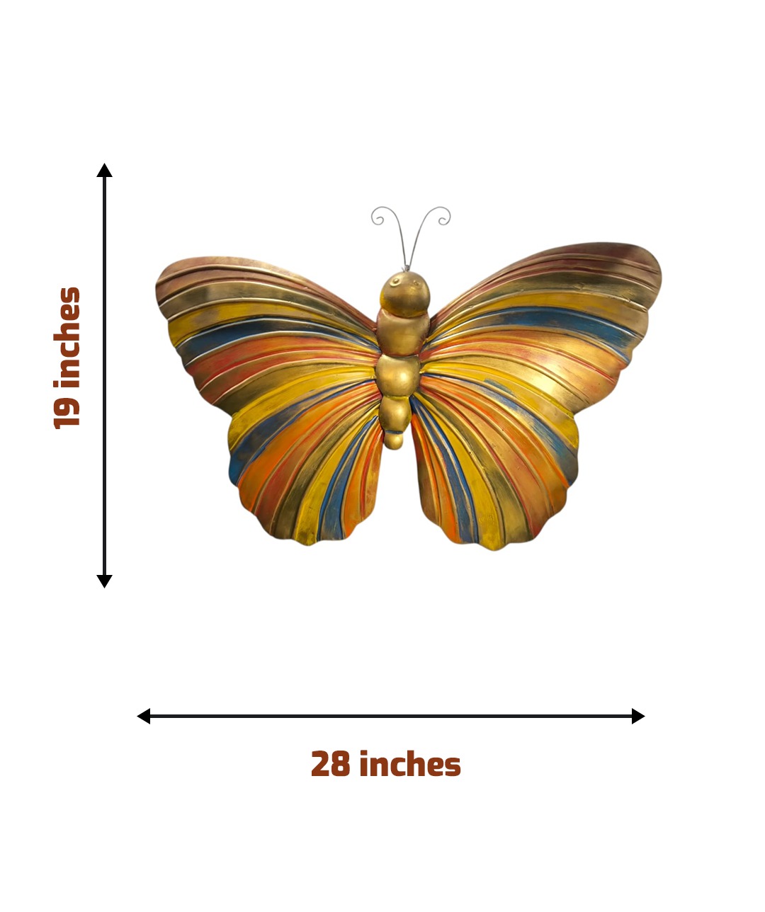 Transform a nursery or playroom with the whimsical charm of this Artistic Striped Butterfly Metal Wall Art. This piece features a series of horizontal multi-colored stripes in shades of gold, orange, yellow, blue, and brown, topped with a polished gold body. Its soft, rounded wings and 3D relief design provide a playful yet modern aesthetic that is perfect for children’s spaces.