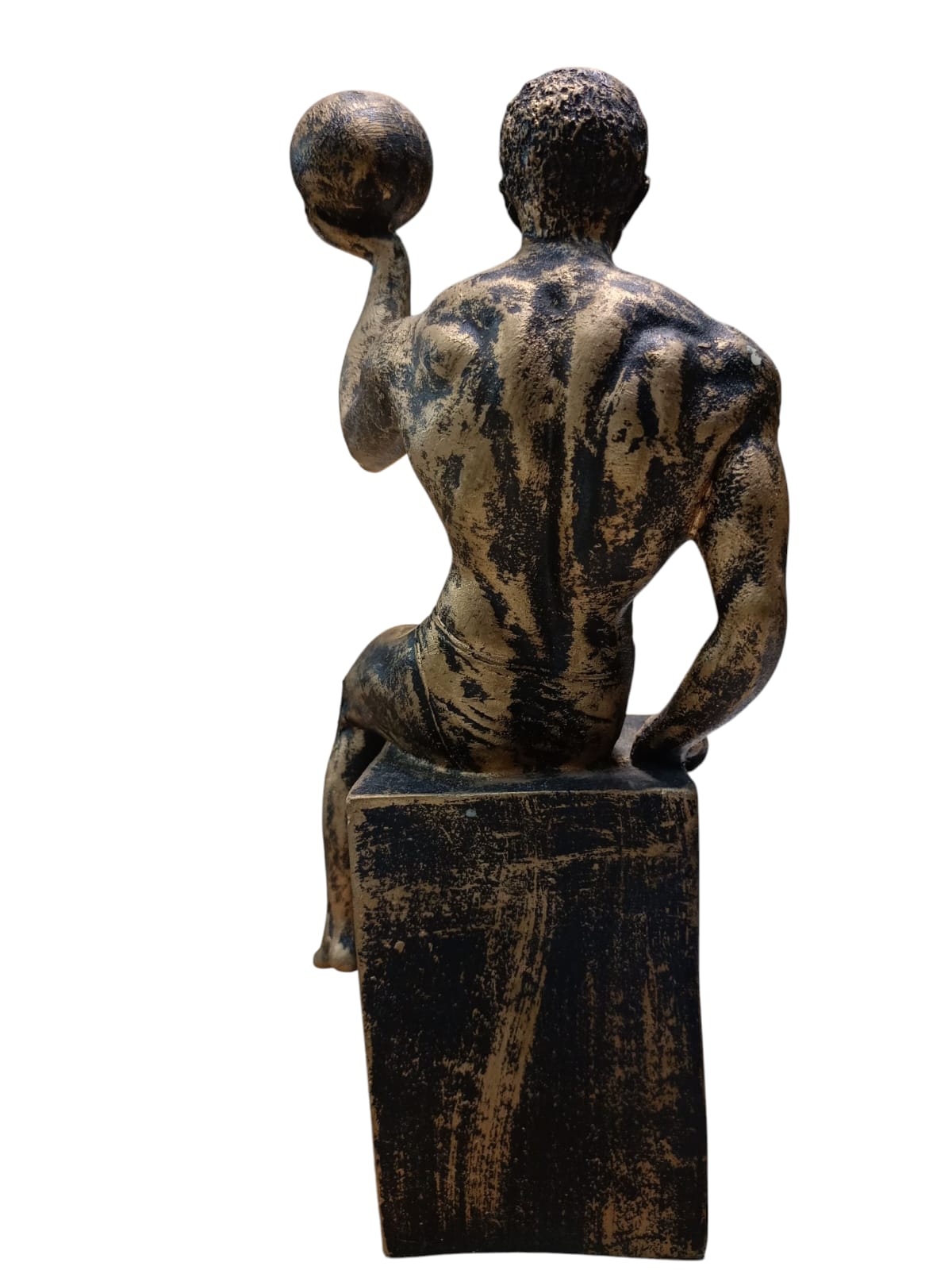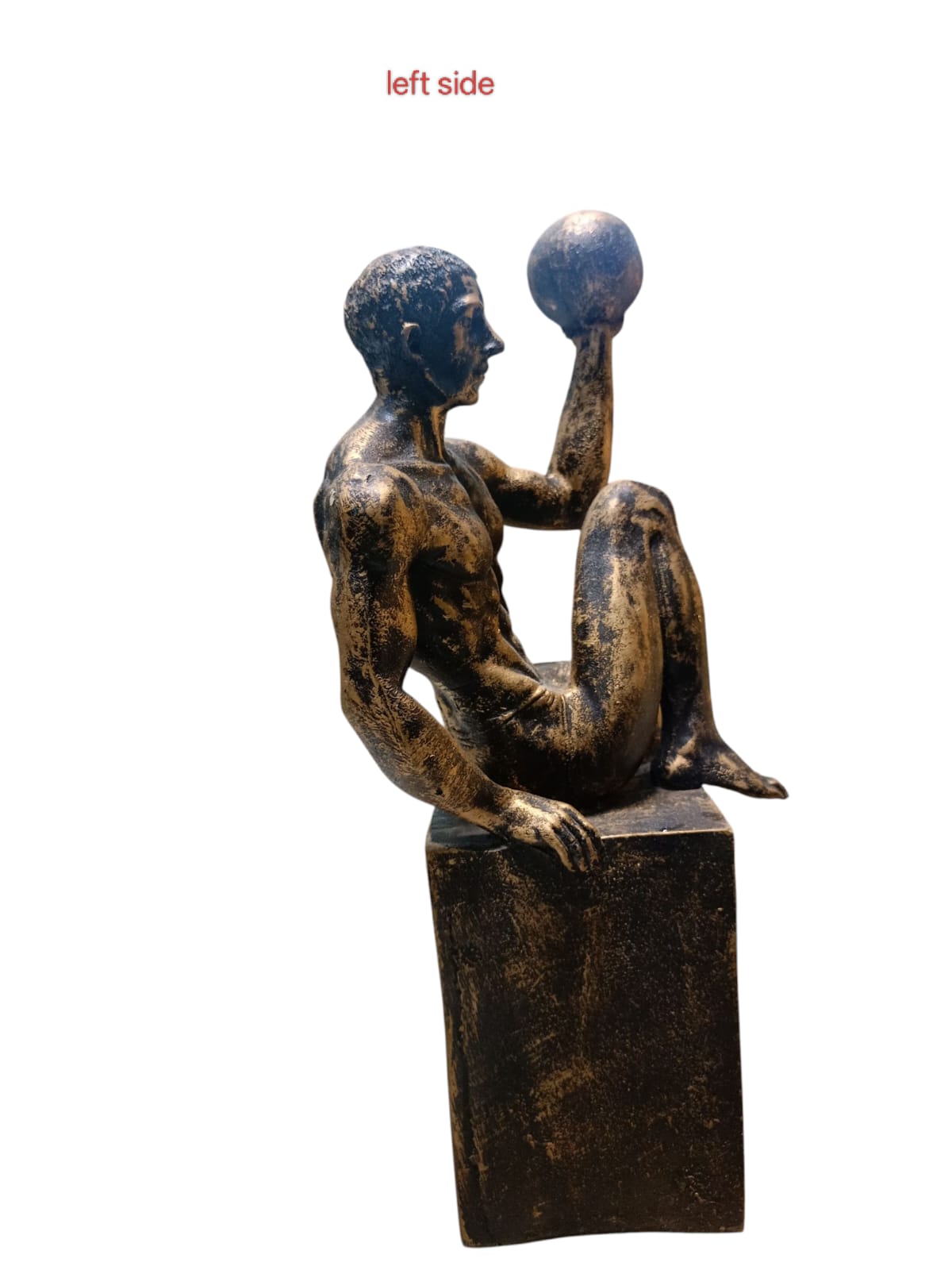 Black-gold seated male statue holding a sphere, athletic and modern style.