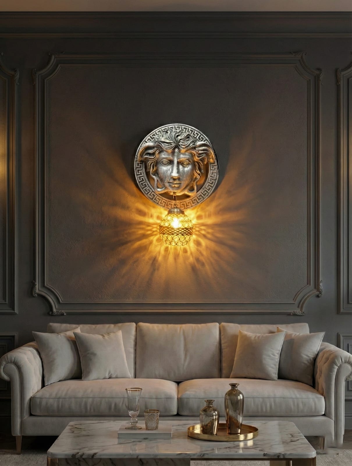 Command attention with the Silver Medusa Head Sconce, a bold, high-fashion piece inspired by classical mythology and luxury design. This powerful fixture instantly elevates any room, blending ancient Grecian motifs with a modern, high-gloss finish. It is the perfect statement piece for contemporary, neoclassical, or glamorous interiors.