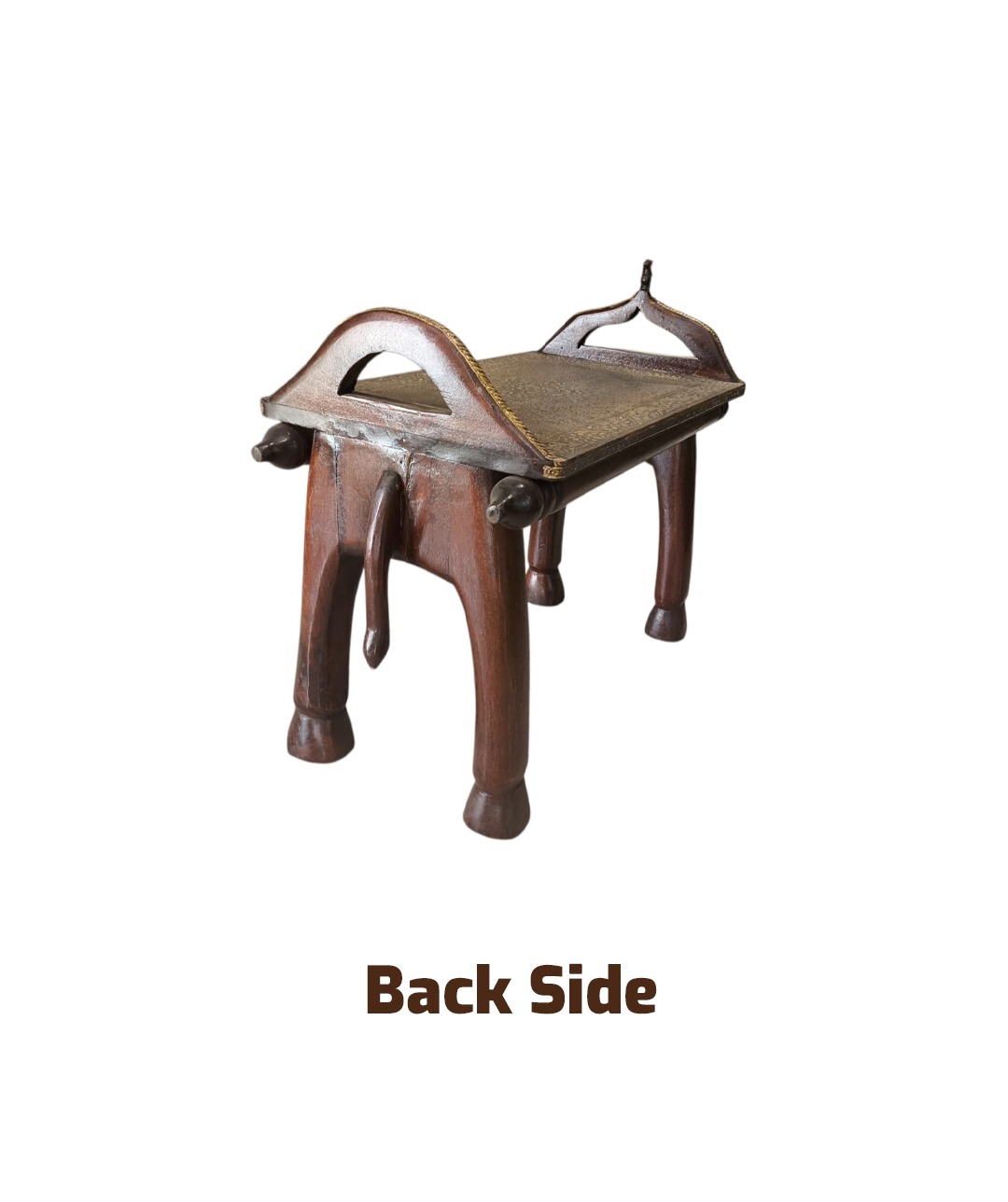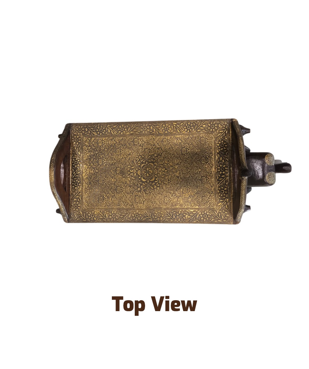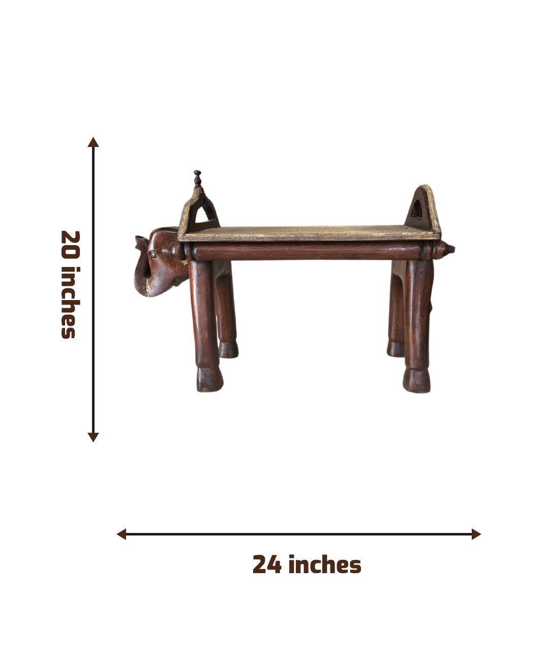 Embossed Brass Top: The flat surface (saddle/seat) features an ornate, engraved brass sheet with a detailed floral design, suitable for holding decorative items or serving.