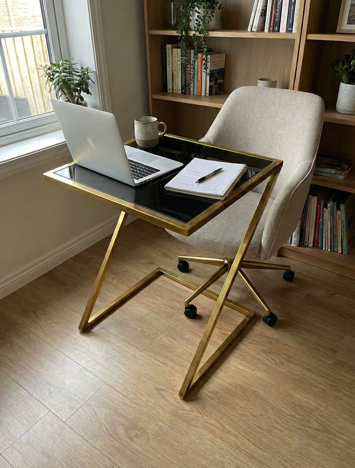 Elevate your living space with this elegant set of 3 Z-shaped nesting tables, crafted with a stunning gold metal frame and a sleek black glass top. Their modern zig-zag silhouette adds a luxurious touch to any corner—perfect for your living room, bedroom, office, or lounge. Use them as laptop tables, coffee tables, side tables, or décor stands. Each piece nests effortlessly into the other, saving space while enhancing style.